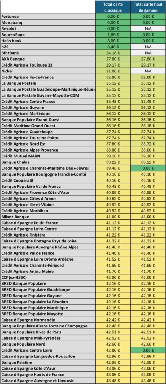 (1) Calculs effectués sur la base des tarifs « à la carte » (hors offre groupée de services donc) chez 124 établissements bancaires, avec une carte classique à débit immédiat et avec une carte premium à débit différé (Visa Premier ou Gold Mastercard). Pour les banques en ligne qui ne proposent que des packages, c'est la formule d'entrée de gamme qui a été retenue pour la première colonne du tableau (avec certaines offres plus haut de gamme, il est cependant possible de payer moins de frais).