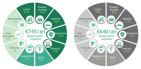 Une récente étude, réalisée l'Action Tank Entreprise et Pauvreté (1) en partenariat, notamment, avec La Banque Postale, tente de quantifier le phénomène. Selon elle, cette « double peine » de la pauvreté atteint 745 euros par an pour les 10% les plus pauvres (ce qu'on appelle le 1er décile), et 640 euros pour le 2e décile. Soit l'équivalent, respectivement, de 3 mois et 2 mois de courses alimentaires. 90% de ces sommes sont concentrée sur 5 postes budgétaires : le logement, l'énergie, la mobilité, l'assurance et l'emprunt.